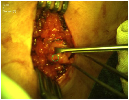The possibility of the camera system visualizing fluorescence with “hands free” imaging enabled continuous visualization of the lymphatic vessels and nodes during the surgery (Figure 1 and Figure 2). The visibility of the fluorescence signal of the SLN depends on the signal-to-background ratio (SBR). To determine SBR, the Quest Research Tool (Quest Medical Imaging, Middenmeer, The Netherlands) was used. The software allows the selection of a region of interest (ROI) from the fluorescence signal of the SLN in the fluorescence image and from adjacent tissue, the background. The SBR is calculated by dividing the average intensity of the pixel values in the SLN ROI by the average intensity of the pixel values in the background. An SBR ≥ 1.1 is considered positive by NIR fluorescence. Sentinel nodes visible under normal light (Figure 1) and under fluorescence (Figure 2) were observed.