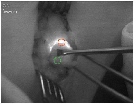 Sentinel node biopsy visible under fluorescence. The ROI are marked.