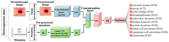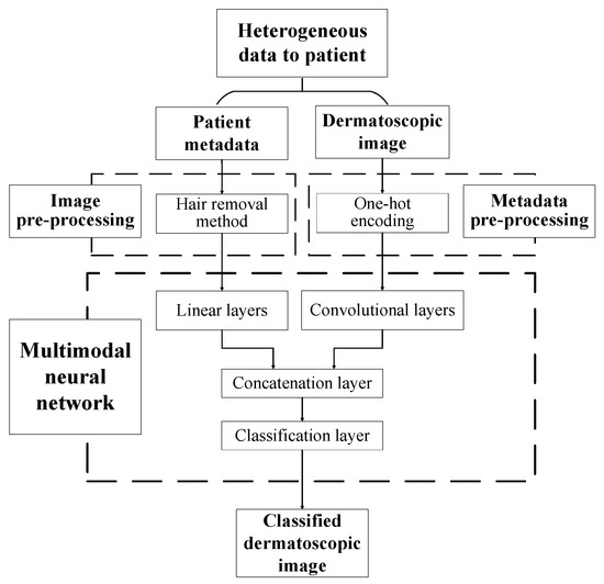 In deep learning, multimodal fusion or heterogeneous synthesis combines different data types obtained from various sources [44]. In the field of diagnosis of pigmented skin lesions, the most common types of data are dermatoscopic images and patient statistics such as age, sex, and location of the pigmented lesion on the patient’s body. Combining visual data, signals, and multidimensional statistical data about patients allows you to create heterogeneous medical information databases that can be used to build intelligent systems for diagnostics and decision support for specialists, doctors, and clinicians [45]. The rationale for using heterogeneous databases is that the fusion of heterogeneous data can provide additional information and increase the efficiency of neural network analysis and classification systems [46]. The use of heterogeneous data in training multimodal neural network systems will improve the accuracy of diagnostics by searching for connections between visual objects of research and statistical metadata [47].