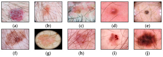 Examples of pigmented skin lesions images with hairy structures: (a) vascular lesions; (b) nevus; (c) solar lentigo; (d) dermatofibroma; (e) seborrheic keratosis; (f) benign keratosis; (g) actinic keratosis; (h) basal cell carcinoma; (i) squamous cell carcinoma; (j) melanoma.