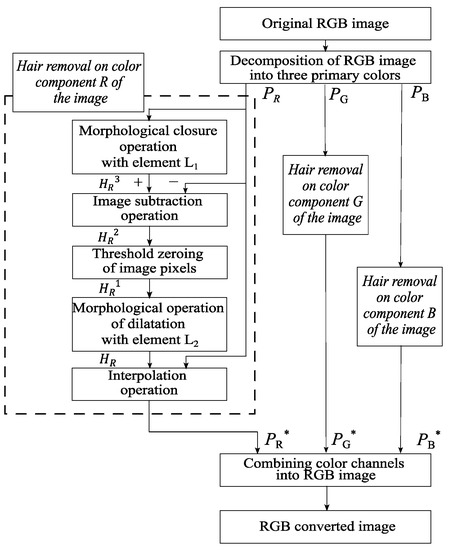 Image processing of pigmented skin lesions consists of four main stages. At the first stage, the RGB image is decomposed into color components. The second step is to locate the locations of the hair structures. At the third stage, the hair pixels are replaced with neighboring pixels. The fourth step is to reverse engineer an RGB color dermatoscopic image.