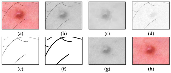 Images obtained as a result of passing each stage of the method of identification and hair removal: (a) input RGB image ; (b) the color component , presented in shades of gray; (c) the result of the closing operation; (d) the result of the subtraction operation (inverted image); (e) the result of zeroing pixels (inverted image); (f) the result of the dilatation operation (inverted image); (g) pixel interpolation result ; (h) output RGB image . Scale bar or magnification.