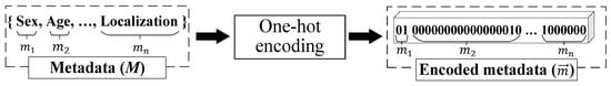 Metadata pre-processing is converting statistical data into the format required by the selected data mining method. Since the proposed multimodal system for recognizing pigmented skin lesions is a fully connected neural network, it must encode the data as a vector of features. A corresponding metadata information vector is generated for each image in the dataset, which depends on the amount and type of statistical information. One-hot encoding can sometimes outperform complex encoding systems [43]. All multi-categorical variables (discrete variables with more than two categories) are converted to a new set of binary variables for one-hot encoding. For example, the categorical variable to denote a pigmented lesion on the patient’s body will be replaced by 8 dummy variables indicating whether the pigmented lesion is located on the anterior torso, head/neck, lateral torso, lower extremity, oral/genital, palms/soles, posterior torso, or upper extremity.