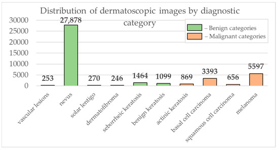Diagram of the distribution of the number of dermatoscopic images in 10 diagnostically significant categories.