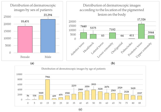 Diagrams of the distribution of the base of dermatoscopic images according to the statistical data of patients: (a) by gender; (b) by age; (c) by the location of the pigmented lesion on the body.