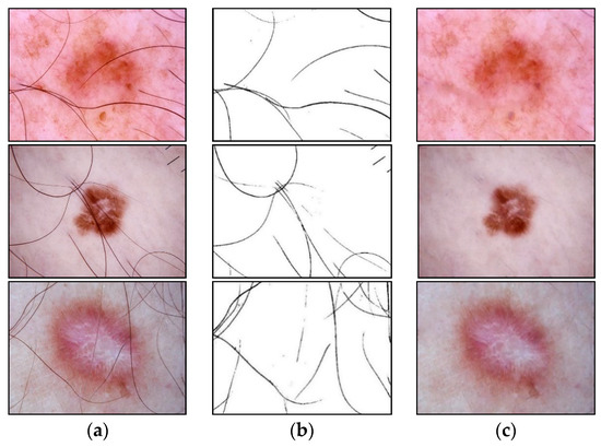 Examples of identification and cleaning of hair structures from dermatoscopic images of pigmented skin lesions using the proposed method: (a) original dermatoscopic image; (b) the result of extracting hair in the image (inverted image); (c) dermatoscopic image cleared of hair structures. Scale bar or magnification.