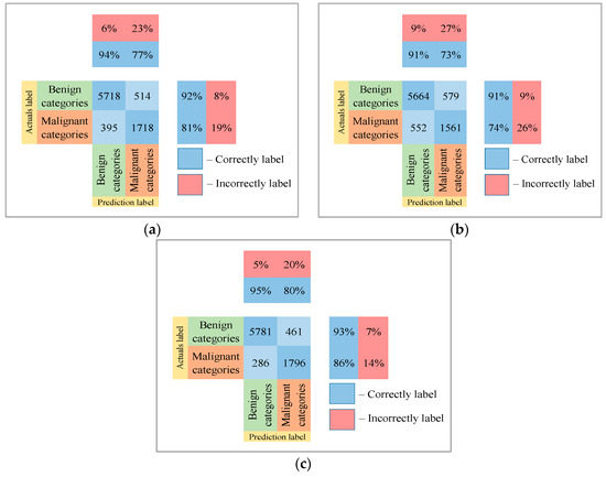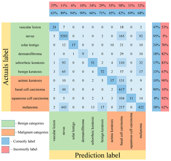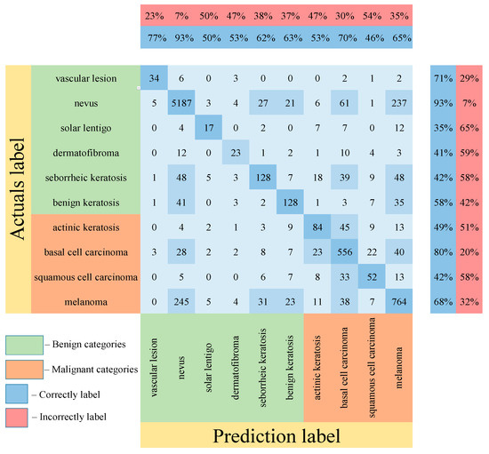Table 5 shows the results of testing the proposed multimodal neural network system for recognizing pigmented lesions with a stage of preliminary cleaning from hair structures. Figure 13, Figure 14 and Figure 15 show confusion matrices resulting from testing multimodal neural network systems for identifying pigmented skin lesions based on various CNNs.