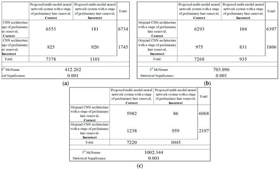 In [60], preliminary hair cleaning is performed using the DullRazor method, and the skin lesion image classification using a neural network classifier. The best result of recognition accuracy was 78.2%. The analysis of heterogeneous data using the proposed multimodal neural network system made it possible to increase the recognition accuracy by 5.4% compared to recognition using a neural network classifier; [61] presents a skin cancer detection system. The preliminary cleaning of dermatoscopic images from hair was performed at the first stage using the DullRazor method. Neural network classification was performed using the K-Nearest Neighbor (KNN). The system’s accuracy was 82.3%, which is 1.3% lower than the recognition accuracy of the proposed multimodal neural network system with the stage of preliminary cleaning of hair structures. The authors of [62] proposed a neural network system for classifying benign and malignant pigmented skin lesions with the stage of preliminary hair removal. This approach made it possible to achieve a classification accuracy of 79.1%, which is 4.5% lower than the recognition accuracy of the proposed multimodal neural network system. Combining and analyzing heterogeneous dermatological data allows the multimodal neural network algorithm to find additional links between images and metadata and improve recognition accuracy compared to the classification accuracy of visual data only by neural network algorithms.