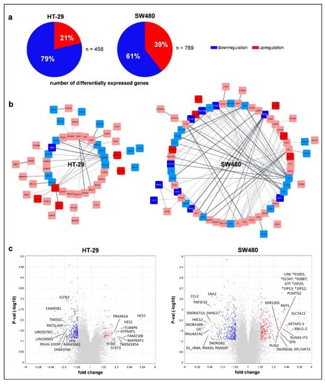 Genome-wide transcriptome alterations of HT-29 and SW480 cells following 10,000 ng/mL folic acid (FA) supplementation detected by Human Transcriptome Array 2.0 (HTA 2.0). (a) Pie charts represent the proportion of up- and downregulated genes. (b) Visual networks of protein–protein interactions were generated by the StringApp of Cytoscape software based on the list of genes with significant (p ≤ 0.05) expression alterations and ≥|1.5| fold change (FC). Colors refer to the expression level of protein-coding genes (dark blue: FC ≤ −2, light blue: FC ≥ −2 and ≤−1.5, light red: FC ≥ 1.5 and ≤2, dark red: FC ≥ 2). (c) Top 10 genes showing significant (p ≤ 0.05) up- and downregulation visualized with volcano plots. Gray points represent all the transcripts detected by HTA 2.0 microarray, while significantly (p ≤ 0.05) altering genes with FC ≥ |1.5| value were marked with red and blue. P-val: p-value.