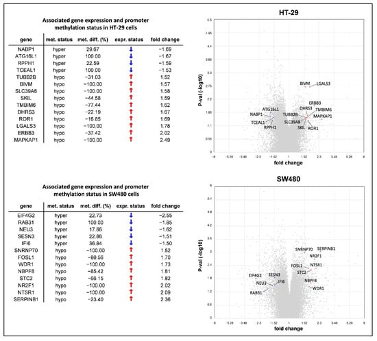 The intersection of genome-wide DNA methylation and gene expression data obtained by Reduced Representation Bisulfite Sequencing (RRBS) and Human Transcriptome Array (HTA) 2.0 analyses. Values represent the methylome and transcriptome pattern changes of 10,000 ng/mL folic acid (FA)-treated HT-29 and SW480 cells compared to non-treated samples (0 ng/mL FA). Only genes with promoter methylation status alteration in accordance with their expression level (p ≤ 0.05 and fold change ≥|1.5|) were listed (left) and also visualized in volcano plots (right). Gray points represent all the transcripts detected by the microarray, while blue ones highlight down- and red ones show upregulating genes from the list. met. status: DNA methylation status; met. diff.: DNA methylation difference; expr. status: gene expression status; P-val: p-value.