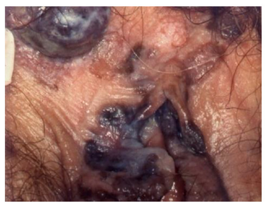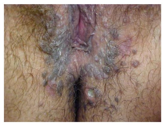 The lesions are typically multiple, discoid, white, or pigmented, and they can affect the whole external genital organs, including the perianal skin (Figure 21 and Figure 22). Some pigmented forms of vulvar HSIL have a specific clinical appearance described as flat gray–brown lesions, hyperpigmented raised lesions, and papillary or verrucous lesions.