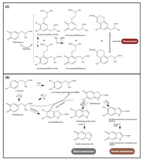 Cutaneous melanogenesis begins with the hydroxylation of the main melanin precursor, tyrosine, to L-3,4-dihydroxyphenilalanine (DOPA), followed by its oxidation to DOPAquinone (DQ), reactions that are catalyzed by the key enzyme of the process, tyrosinase. Depending on the availability of the substrate, DQ undergoes further modifications directing the process into one of the two possible pathways [34]. When their intracellular levels are elevated, sulfurous compounds such as the amino acid cysteine react with DQ, producing two isomers: 5-S-cysteinyldopa (5-S-CD) and 2-S-cysteinyldopa (2-S-CD). Further oxidation of these isomers leads to benzothiazine intermediates that polymerize to benzothiazole moieties and pheomelanin (Figure 1A) [34,35]. When sulfurous substrates are deficient within melanosomes, DQ spontaneously undergoes an intramolecular cyclization to produce cycloDOPA, which, through a redox process, yields DOPAchrome. Finally, the latter compound rearranges to produce DHI and DHICA units that polymerize to eumelanin (Figure 1B) [35].
