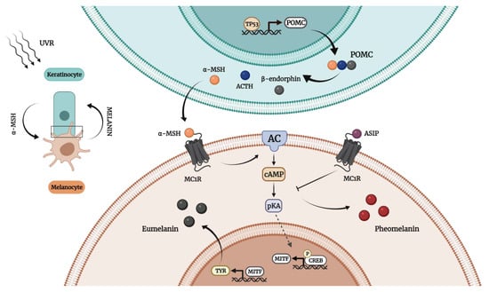 Both melanogenesis and the type of melanin produced depend on a series of factors such as genetic control, hormonal stimulation, enzymes’ translation and proper functioning, reaction media pH, and the substrate available for synthesis. Thereby, the presence of the amino acid cysteine leads to pheomelanin synthesis, whilst its absence encourages the production of eumelanin [34]. Skin pigmentation is controlled by numerous genes involved in the proper functioning of melanocytes, transcription of melanogenic enzymes, and expression of specific receptors [36]. Melanogenesis is regulated via melanocortin-1 receptor (MC1R) signaling [30]. MC1R, a G-protein-coupled receptor expressed on the membrane of melanocytes, is described as a major regulator not only in skin pigmentation, but also in other physiological functions (e.g., control of oxidative stress and genomic integrity) [37]. MC1R’s signaling pathway depends on its interaction with endogenous ligands that are classified as (i) agonists—i.e., α-melanocyte stimulating factor (α-MSH) and ACTH (Adrenocorticotropic hormone (ACTH), or (ii) antagonists—i.e., Agouti signaling proteins (ASIP) [30]. Binding of an agonist to MC1R triggers melanogenesis in a cyclic adenosine monophosphate (cAMP)-dependent manner [36]. MC1R stimulation leads to adenylate cyclase (AC) activation, increasing the intracellular levels of cAMP [34]. Through protein kinase A (pKA), cAMP promotes the phosphorylation of the cAMP response element binding (CREB) protein, which stimulates microphthalmia-associated transcription factor (MITF) overexpression. The final step of this cascade of reactions is the transcription of tyrosinase [34]. Tyrosinases are highly heterogeneous and widespread enzymes that catalyze, using copper as a cofactor, the hydroxylation of monophenols and subsequent oxidation of diphenols to quinones [30]. The MC1R activation also increases the melanosomal pH from acidic to neutral values, at which the catalytic efficiency of tyrosinase and eumelanin synthesis are enhanced [35]. On the other hand, the ASIP–MC1R interaction reduces the cellular cAMP levels, inhibiting MITF expression and tyrosinase translation, which finally leads to pheomelanin synthesis [30]. In fact, ASIP competitively blocks the binding locus for α-MSH [30], acting as an inverse agonist [35]. Once formed, melanin can be either retained within melanocytes or transferred to other cells. For instance, skin melanosomes containing melanin are transported to the surrounding keratinocytes, whereas in the retinal pigment epithelium of the eyes, melanin is preserved within melanocytes [29]. Upon UV irradiation, keratinocytes trigger melanogenesis by secreting promelanogenic compounds including α-MSH, ACTH [30], and β-endorphin [36], which result from the proteolysis of a multicomponent precursor polypeptide encoded by the pro-opiomelanocortin (POMC) gene (Figure 2) [38].