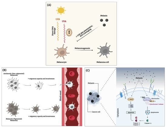 Melanin implications in cancer development. (A) Cancer prevention—melanin counteracts UVR-induced damage and melanomagenesis; (B) cancer metastasis—differential metastatic potential of melanoma cells depending on the presence of intracellular melanin; and (C) cancer treatment—melanin exerts a pro-apoptotic effect against cancer cells. This image was created using BioRender (BioRender.com). ↑ increased; ↓ decreased.