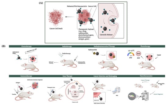 (A) Targeted delivery of therapeutics to cancer cells by melanin/PDA nanoparticles, and (B) main applications of melanin/PDA nanoparticles in cancer therapy. This image was created using BioRender.com.