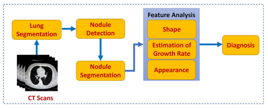Computer-aided diagnosis (CAD) systems: A large public database was generated to provide data that can be used to assess the performance of CAD detection and diagnostic systems and help further development. It is called the Lung Image Database Consortium and Image Database Resource Initiative (LIDC-IDRI). The creation of this database required great efforts as CAD was not used in annotation of images included [80]. Other databases such as data derived from the Dutch-Belgian NELSON lung cancer screening trial and LUNA16, LIDC, DSB2017, NLST, TianChi, and ELCAP datasets were utilized by most of the current research works dealing with CAD and deep learning (DL) [81]. The first step in the process of nodule detection is to unsharp the CT images by changing the image threshold which improves discrimination of pulmonary nodules from the rest of the surrounding lung parenchyma. A series of 3D cylindrical and spherical filters and template matching were used to detect small lung nodules [82,83,84,85,86,87,88,89]. However, the geometry of the candidate nodules doesn’t always fit into these spherical, cylindrical, or circular assumptions as it may be spiculated by its nature or due to attachment to nearby pleural surface or blood vessel [90]. Other studies proposed methods to detect lung nodules using k-means clustering technique [91,92,93] with further utilization of rule-based classifiers and linear discriminate analysis (LDA) to eliminate normal lung structures and reduce FPN. One study tried to solve the problem of eliminating an overlapping or contacting blood vessel by choosing a proper region of interest (ROI) in a 3-step model [94]. On the other hand, Oda et al. [95] and Siata et al. [96] used 3D algorithms; 3D filter by orientation map of gradient vectors and 3D distance transformation to overcome the same problem. Brown et al. [97] used prior patient images to create a specific model, so that any change in size and morphology of pulmonary nodules could be detected in follow up images easily. Messay et al. [98] used a fully automated CAD system that utilizes intensity thresholding and morphological operations to detect pulmonary nodules with a sensitivity of with 3 FPN/scan. A set of 245 features was computed for each segmented lung nodule and Fisher Linear Discriminant (FLD) classifier was utilized. Similarly, Setio et al. [99] designed a CAD system to detect pulmonary nodules larger than 10 mm. They also used a multi-stage process of thresholding and morphological operations, then the extracted nodules were segmented and a set of 24 features was computed, finally the nodules were classified via a radial based vector supporting machine (VSM). A recent study aimed to solve the problem of using uncertain class data through the application of a CAD system based upon semi-supervised extreme learning machines (SS-ELM). This was done by using both certain class feature sets with labels, and unlabeled feature sets for training [100].