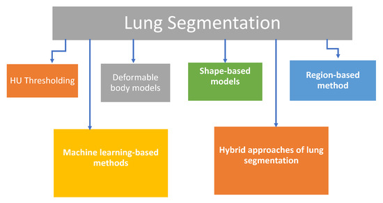 The first step in almost every CAD system dealing with lung disease is the segmentation. In this step, a preferred structure is delineated from its surrounding prior to analysis. Lung segmentation is very challenging due to different existing structures with near-similar densities such as the bronchi, bronchioles, pulmonary artery, and vein branches. Lung segmentation techniques can be categorized into four main categories based on: (1) Hounsfield unit (HU) threshold, (2) deformable boundaries, (3) shape models, (4) region/edge-based models, in addition to machine learning (ML) based methods and hybrid techniques which utilize a combination of methods to overcome the drawbacks of using single method (Figure 2). Details of the different categories are given below.