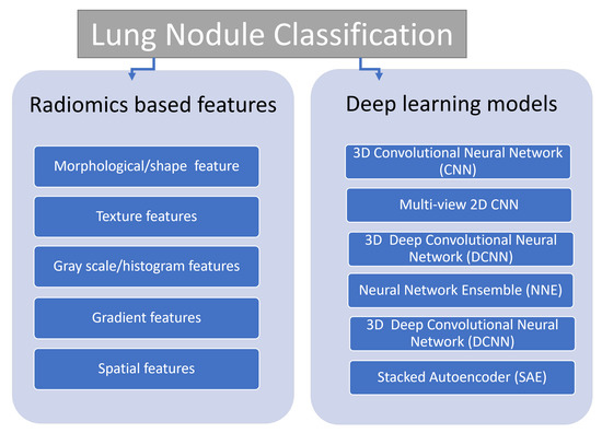 One of the major limitations of using CAD systems in the detection of lung nodule is the high false positive rate which hinders the accuracy and lowers its efficacy as a screening framework that could be used on a large scale population. False positive nodules are associated with extra costs and hazards as they lead to unnecessary biopsies, more prolonged follow up imaging, and extra worry by patients and their families. So, accurate classification of detected pulmonary nodule is of utmost importance to overcome these problems. After nodule detection and segmentation, comes nodule classification. TPNs are classified by two large architectures: either radiomics feature-based scheme or deep learning models [136,137,138,139] (Figure 3). The feature radiomic scheme uses different sets of features, that could be morphological/shape (spherical disproportion, circularity … etc.), texture features, gray scale/histogram features (average, standard deviation, skewness…), gradient features (average, standard deviation, kurtosis…), and spatial features (location of the nodule) [140,141]. The extracted data from image voxels are then gathered and transformed into numeric form called feature radiomics [142]. A group of numeric features (radiomics) represent what is called feature vector. Then, a classifier (which is a machine learning model) differentiates feature vectors according to training algorithms and labelled data [143]. Famous classifiers include support vector machine, and random forest [144]. The advantage of radiomics model is that it could build models of high performance out of limited datasets, yet it requires manual tumor segmentation and hand-crafted feature extraction [145,146,147].