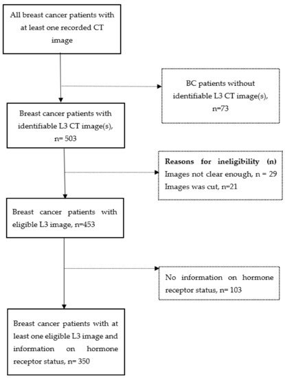 Women diagnosed with breast cancer and received breast cancer treatment at the University of Florida Health Shands Hospital from October 2011 to April 2020, were identified through the local tumor registry linked to an electronic medical record (EMR) system. Eligible participants were women aged 20–75 years at diagnosis and with an abdominal or pelvic CT, including positron emission tomography-computed tomography (PET-CT) scan. In our sample, the majority (78.5%) of scans were taken after the breast cancer diagnosis, consistent with the fact that CT scans are prescribed for staging breast cancer. For patients with multiple CT images, the priority was to select a scan prior to and closest to breast cancer surgery. We excluded patients with a history of diabetes because diabetes and its treatment may influence obesity-related signaling pathways [20,21]. A total of 576 breast cancer patients had at least one recorded CT image. Out of these, we excluded breast cancer patients without an identifiable image at the 3rd lumbar vertebra (L3) (n = 73), without an eligible L3 CT image, i.e., unclear, incomplete, or distorted images (n = 50), and those with no information on hormone receptor status (n = 103), resulting in a final sample of 350 (Figure 1). Among the sample, 121 (35.2%) of women had body composition assessed pre-surgery, the average time from their CT scan to surgery was 15.20 ± 16.8 months. 223 (64.8%) women had body composition assessed post-surgery, and the average time from surgery to CT was 20.70 ± 20.7 months. The protocol was approved by the Institutional Review Board of the University of Florida.