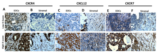 CXCR4-CXCL12-CXCR7 axis is expressed in epithelial and stroma in advanced EOC. CXCR4-CXCL12-CXCR7 expression in epithelial (A,C,E) and stromal cells (B,D,F) for low (upper panel) and high H-score (lower panel) expression based on best cut-off value for each biomarker component (tumor or stroma) (400× magnification; bars 50 µm).