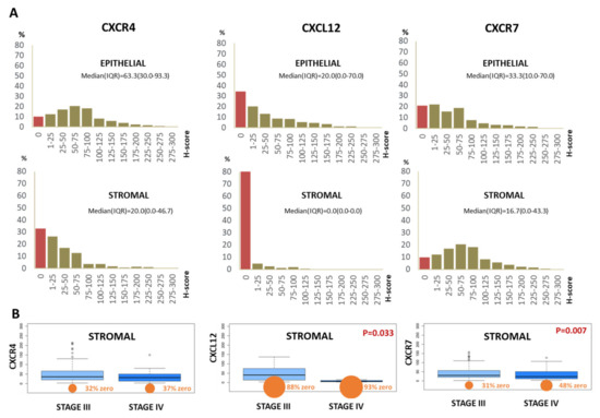 Decrease in stromal CXCR7 and CXCL12 in FIGO stage IV. Relative distribution of CXCR4-CXCL12-CXCR7 in EOC epithelial and stroma (A). CXCR4-CXCL12-CXCR7 percentage in epithelial and stromal cells (% of epithelial) in each H-score interval (X axes). Y axes showed the % of individuals with a given interval of CXCR4-CXCL12-CXCR7 expression. The median with interquartile range (IQR) was also reported, as a measure of central tendency for a skewed dataset. Box whisker plots showed the association between FIGO stage (stage III vs. IV) and CXCR4- CXCL12-CXCR7 expression (B).