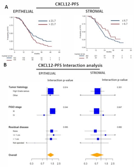 CXCL12 epithelial expression identified risk patients for PFS. PFS and epithelial and stromal CXCL12, Kaplan–Meier curves for identified cut-off on PFS CXCL12 (A). Forest plot of hazard ratios (HR) of progression-free survival, and 95% CI, evaluated in different subgroups (Cox proportional hazards model analysis) and interaction comparison between prognostic factor and CXCL12 in epithelial and stromal cells. The x-axis represents the odds ratio on a log scale with the reference vertical line, odds ratios (square) and 95% CI (whiskers) (B).