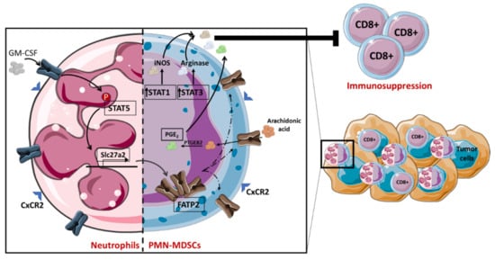 Neutrophils reprogramming to PMN-MDSCs. GM-CSF attaches to the neutrophil receptor, which undergoes gene rearrangement via STAT5 phosphorylation, leading to scl27a2 gene transcription and FATP2 expression. This mechanism leads to the conversion of neutrophils to PMN-MDSCs. Once the reprogramming is complete and FATP2 is attached to the membrane, the PMN-MDSCs will absorb the arachidonic acid, which will be responsible for the synthesis and the secretion of PGE2. The latter, as well as iNOS (produced in response to STAT1 signaling pathway) and arginase (produced in response to STAT3 signaling pathway) will induce the suppression of CD8 T lymphocytes and therefore lead to the proliferation of cancer cells.