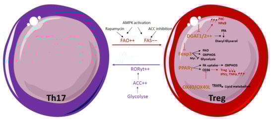 Although T-cell differentiation is mostly dictated by the cytokine environment, both FFA and triglyceride (TGs) content in the extracellular environment can influence this process by promoting the generation of a specific T-helper subset. This is particularly described for Th17 and Treg subtypes, the differentiation of which is particularly affected by these parameters. Th17 cells are already known for their plasticity and ability to switch toward Th1-like or Treg-like phenotype depending on the extracellular environment [76], and, recently, it appeared that glycolysis and FA synthesis are also implicated in this process [77]. Like other effector T cells, the Th17 subset primarily uses glycolysis, and glucose deprivation or Rapamycin treatment drastically reduces their proliferation [78]. However, Th17 cells still present reliance on FAS that was found to be more pronounced than in Th1 cells but not as much as in Treg cells [77]. Consistent with the need for FAS by Th17 cells, activation of the AMPK pathway in vitro and in vivo results in a decrease of the Th17 cell population in favor of Tregs by promoting FAO and shutting down FAS [79]. Additionally, Rapamycin-induced mTOR inhibition appears to promote the Treg population in mice by facilitating FAO while inversely abrogating glycolysis in Th17 cells [80]. Consistent with this, FAS disruption mediated by ACC inhibition was also shown to restrain Th17 cell generation and to promote Treg development, indicating that Tregs rely on the uptake of exogenous FFAs [64]. Conversely, obesity in humans preferentially allows Th17-cell differentiation by inducing ACC1 expression, which in turn increases the production of retinoid-related orphan receptor gamma t (RORgt) ligand and thereby its binding to the il17a promoter [81].