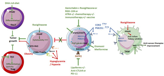 In MDSCs, activation of PPARγ attenuates immunosuppression [58]. Furthermore, in a model of pancreatic cancer, the combination of gemcitabine and rosiglitazone decreases the immunosuppression induced by MDSCs and restores the efficiency of CD8+ T cells [111].