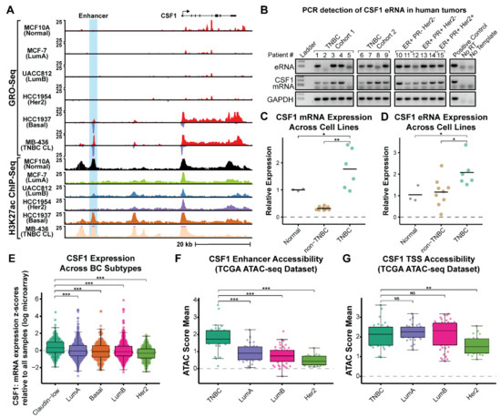 We next sought to confirm our GRO-seq analysis using qRT-PCR across the breast cancer cell lines. We chose representative cells from each subtype and combined them into groups based on their classification as normal immortalized epithelial cell lines (MCF10A), non-TNBC cell lines (MCF7, HCC1954, and UACC812), or TNBC-specific cell lines (MDA-MB-436 and HCC1937). Our results confirmed that we could detect significantly more CSF1 mRNA and eRNA in the TNBC cell lines when compared to normal or non-TNBC (Figure 1C,D). To determine if these transcripts could also be detected in human tumors, we procured nine samples collected from TNBC patients and six from non-TNBC patients for analysis of CSF1 expression. We performed reverse transcriptase PCR (RT-PCR) with primers specific to either eRNA or mRNA transcripts, demonstrating that both could be detected in human tumors (Figure 1B). However, variations in RNA quality, time of storage for samples, and the quality of each tumor specimen obtained made it challenging to quantitatively measure the differences in eRNA expression levels across this small sample size of human tumors. Instead, we leveraged much larger datasets to examine the quantitative changes in the expression of CSF1 mRNA across BC patients. We found that CSF1 is most highly expressed in TNBC Claudin-low patients and is significantly higher than the next highest subtype, Luminal A (p-value = 9.436 × 10−6, Welch two sample t-test) (Figure 1E) [60]. To determine if the activity of the enhancer might be contributing to the increased CSF1 expression in TNBC tumors, we analyzed The Cancer Genome Atlas (TCGA) ATAC-seq data to compare the chromatin accessibility landscape of this enhancer across 133 breast cancer samples [89]. Patients were separated into groups based on BC subtype (PAM50 classification), and accessibility scores were calculated based on the mean ATAC-seq score for the five bins overlapping the enhancer region. We found that the CSF1 enhancer is significantly more accessible in TNBC patients as compared to the HER2, LumA, and LumB groups (p-values of 2.25 × 10−9, 3.02 × 10−7, and 8.59 × 10−10, respectively) (Figure 1F). This demonstrates that enhancer accessibility, which is required for enhancer function, is greater in the TNBC group. Interestingly, the CSF1 mRNA transcription start site (TSS) showed similar chromatin accessibility in the TNBC group compared to LumA and LumB groups and while exhibiting more accessibility compared to the HER2 group (p-values of 2.28 × 10−3, 0.23, and 0.46, respectively). This suggests that the CSF1 mRNA promoter is viable in all subtypes and the enhancer may be responsible for amplifying the expression in TNBC patients (Figure 1G). Taken together, these results suggest that a novel regulatory element ~30 kb upstream of the CSF1 gene is more highly transcribed in triple-negative breast cancer patients and is associated with increased expression of CSF1 mRNA.