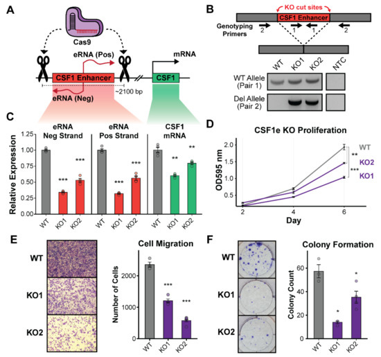 To determine if this eRNA-producing enhancer is a bona fide enhancer of CSF1, we employed a CRISPR-Cas9 approach to knockout the genomic region containing the enhancer in the TNBC claudin-low cell line, MDA-MB-436. This cell line was chosen because CSF1 expression is highest in this cell line as determined by GRO-seq (Figure 1A); it is also highest in claudin-low TNBC patients (Figure 1E). A combination of four single guide RNAs (sgRNAs) were designed to deliver Cas9 to the 5′ and 3′ flanking regions of the enhancer (two sgRNAs per flank), resulting in a ~2100 bp deletion that removed the entirety of the transcribed enhancer (Figure 2A). The resulting CSF1 enhancer knockout (CSF1e-KO) clones were individually genotyped for the presence of a deletion allele and/or WT allele (Figure 2B). No clones were found to be homozygous for deletion of the CSF1 enhancer, which we suspect may have been lethal to the cells; however, several heterozygous deletion clones were identified, and two (CSF1e-KO1 and CSF1e-KO2) were selected for further investigation (Figure 2B). Quantitative reverse transcriptase PCR (qRT-PCR) was used to measure the changes in CSF1 eRNA and mRNA expression in wild type vs. CSF1e-KO cells. We found that the deletion of at least one CSF1 enhancer allele led to a significant reduction in both positive and negative strand eRNA transcription (Figure 2C). This also resulted in a significant decrease in CSF1 mRNA, suggesting that this region is acting to amplify expression of the CSF1 gene. To confirm these results in an independent cell line, we generated CSF1 enhancer knockouts in the MDA-MB-468 TNBC basal cell line with the same sgRNAs. Using qRT-PCR, we confirmed the results observed in the MDA-MB-436 cell line by showing a comparable decrease in CSF1 mRNA expression when the enhancer was deleted (Supplementary Materials Figure S1A). To examine if the enhancer is providing growth or migration advantages to TNBC cells, the CSF1e-KO cell lines were assayed for changes in biological phenotypes. Measuring the proliferation potential of CSF1e-KO cells compared to WT over a 6-day time course showed a significant reduction in growth associated with the deletion of the enhancer (Figure 2D). We next explored if enhancer loss could have an impact on cancer cell motility. Transwell migration assays using only fetal bovine serum as a chemoattractant displayed a significant decrease in cell movement when comparing CSF1e-KO to WT (Figure 2E). Finally, we investigated whether the CSF1 enhancer could be providing cells with a growth advantage by promoting survival and expansion of single cells into larger colonies. To address this, we employed a colony formation or clonogenic assay and found that enhancer deletion correlated with a significant reduction in colony-forming potential compared to WT TNBC cells (Figure 2F). To determine if these observations could be the result of cell death induced by enhancer knockout, we performed an apoptosis assay using propidium iodide and Annexin V-Alexa Fluor staining combined with flow cytometry. This experiment revealed a small increase in early apoptotic cells (Annexin V+/PI−) and dead cells (Annexin V+/PI+) but does not show enough change to explain the phenotype changes observed in previous assays (Supplementary Materials Figure S1B–D). Taken together, these results demonstrate that this regulatory element is a true enhancer of the CSF1 gene and that CSF1 overexpression could be contributing to the aggressive growth characteristics observed in TNBC cells.