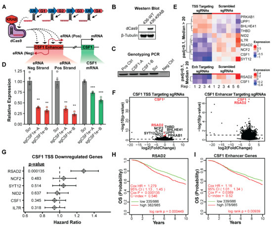 Epigenetic silencing of the CSF1 enhancer reduces CSF1 mRNA expression and identifies target genes significant to patient outcome. (A). Diagram showing the approach for CRISPRi epigenetic silencing of the CSF1 enhancer. A construct containing four guide RNAs targeting distinct areas of the CSF1 enhancer was transduced into dCas9-KRAB expressing MDA-MB-436 cells, facilitating targeting of the enhancer for epigenetic repression. (B). Western blot showing expression of dCas9-KRAB protein in cell lines used for this work. β-tubulin is shown below as a loading control. (C). Genotyping PCRs demonstrating insertion of the guide RNA expression vector within TNBC cell lines. (D). qRT-PCR showing changes in CSF1 eRNA or mRNA expression resulting from dCas9-KRAB targeting of the CSF1 enhancer. CSF1-A and CSF1-B are independent cell lines (biological replicates) expressing dCas9-KRAB and the same sgRNA expression vector. Bars represent mean fold change (relative to scrambled sgRNA expressing cell line) and points show individual fold change values for each replicate. Significance determined by a two-sided t-test comparing each KO line to WT (** p < 0.01, *** p < 0.001). n = 4. (E). RNA-seq heatmap displaying the changes in gene expression resulting from CRISPRi perturbation of the CSF1 transcription start site (top) or enhancer (bottom). CSF1 TSS or enhancer targeting replicates shown on the left, n = 4. Negative control scrambled replicates shown on the right, n = 6. (F). Volcano plots showing differential gene expression (p-value versus fold change difference) results by CRISPRi perturbation of the CSF1 transcription start site (left) or enhancer (right). Genes shown in red are significantly downregulated. (G). Forest plot showing hazard ratios for the genes downregulated in the CSF1 TSS targeting samples. (H). Kaplan–Meier plot showing patient overall survival probability separated by high or low expression (median centered) of RSAD2 using the METABRIC patient cohort. (I) Kaplan–Meier plot showing patient overall survival probability separated by high or low expression of CSF1 and RSAD2.
