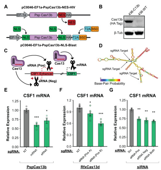 With a clinical significance established for this novel enhancer, we next sought to understand how eRNA transcription contributed to the function of the enhancer. There are several models for enhancer function that place varying levels of importance on the eRNA transcripts produced [45]. Some suggest that the act of transcription is sufficient for enhancer function with no direct role for the eRNA transcript itself [99,100]. Others indicate that the transcripts can perform a post-transcriptional role that is necessary for target gene upregulation [38,39,40,42,43,48,49,50,51,101,102,103,104,105,106,107,108,109,110,111,112,113,114]. Further complicating the matter, these studies demonstrate that enhancers can use distinct mechanisms of function at different loci. Of note, while CRISPRi epigenetic repression of the enhancer led to a downregulation of CSF1 mRNA, this does not clarify whether the loss of eRNA production or the disrupted enhancer–promoter interaction caused by KRAB are responsible for this change. It is possible that either of these changes alone or both together are necessary to observe this result. Therefore, separating the opportunity for enhancer–promoter physical interaction and the act of transcription from a post-transcriptional role for eRNAs requires techniques that allow for direct perturbation of transcripts without altering enhancer transcription or the underlying DNA. To address this, we modified and employed a recently described approach using Cas13, an RNA-guided CRISPR enzyme that allows for targeted cleavage of RNA transcripts with a high degree of accuracy and efficiency [115,116,117,118,119]. Cas13 functions similarly to DNA targeting CRISPR enzymes such as Cas9 but instead binds and cleaves RNA transcripts. To facilitate the targeted degradation of eRNA transcripts, we leveraged the pC0046-EF1a-PspCas13b-NES-HIV (Addgene #103862) vector containing the Prevotella Sp. (Psp) Cas13b enzyme in a lentiviral vector. We modified this plasmid to enable targeting within the nucleus by removing the nuclear export signal, inserting multiple nuclear localization sequences, and introducing a blasticidin resistance gene for clonal selection (Figure 4A). MDA-MB-436 TNBC cells were transduced with this modified PspCas13b vector to create a stable expression cell line that was confirmed through Western blot using an antibody that recognizes Cas13b via the HA tag (Figure 4B). Target sites for sgRNAs were carefully selected using both the Cas13 Guide Design Resource (https://cas13design.nygenome.org) and RNAfold (http://rna.tbi.univie.ac.at/cgi-bin/RNAWebSuite/RNAfold.cgi) to predict regions of the eRNA transcripts that are likely to form secondary structures that can prevent an sgRNA from recognizing its target sequence (Figure 4D). To mitigate the effects of secondary RNA structures, multiple sgRNAs were designed and pooled per target transcript. The transfection of sgRNAs followed by qRT-PCR to examine CSF1 mRNA expression shows that targeting the mRNA directly with Cas13b has the most robust knockdown effect (Figure 4E). This outcome demonstrates that Cas13b is capable of cleaving the CSF1 mRNA for targeted knockdown. Next, we targeted the CSF1 enhancers RNAs (both positive and negative strand) using Cas13b and found that this was sufficient to cause a significant decrease in CSF1 mRNA levels (Figure 4E). This suggests that the CSF1 eRNA transcripts are required post-transcriptionally for mRNA upregulation, as this technique degrades targeted transcripts but does not impact their transcription.