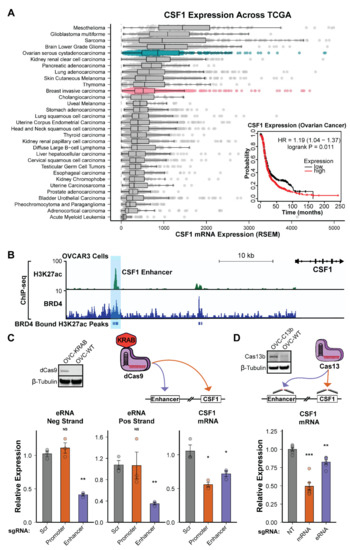 To further test the mechanisms of CSF1 enhancer function and determine if our observations about this enhancer are extensible to other cancer types, we surveyed the TCGA Pan-Cancer Atlas dataset to identify other types of cancer in which CSF1 is highly expressed. Interestingly, we found that ovarian cancer was among the highest in CSF1 mRNA expression (RSEM) and even surpassed breast cancer (Figure 5A). In addition, we found that increased CSF1 expression was correlated with a worse outcome in ovarian cancer patients, as determined by a Kaplan–Meier survival curve (Figure 5A). To ascertain if the enhancer was active in ovarian cancer cells and may be responsible for this increased expression, we downloaded publicly available H3K27ac and BRD4 ChIP-seq datasets and looked for the enrichment of these marks at the CSF1 enhancer region (Figure 5B) [54,55]. In the absence of publicly available GRO-seq data, we instead relied on a combination of H3K27ac and BRD4 ChIP-seq to indicate activity of the enhancer. Bromodomain-containing protein 4 (BRD4) is known to be enriched on active enhancers, and combined with H3K27ac, provides a robust method to identify active enhancers [121,122,123]. As seen in Figure 5B, the CSF1 enhancer is highly active in the high-grade serous ovarian cancer cell line OVCAR3. Therefore, to test our model in ovarian cancer cells, we created dCas9-KRAB expressing OVCAR3 cell lines and repeated the CRISPRi experiments using the same sgRNAs to epigenetically repress the CSF1 enhancer. We found that inhibition of the enhancer led to a decrease in CSF1 mRNA and both eRNA transcripts (positive and negative strand), matching the results observed in TNBC cell line experiments (Figure 5C). In this experiment, we also targeted the CSF1 TSS with sgRNAs designed to repress transcription of the mRNA without inhibiting the enhancer. Interestingly, we found that directly targeting the TSS led to the most robust knockdown in mRNA levels but did not affect the expression of either eRNA transcript (Figure 5C). Next, we created Cas13b expressing OVCAR3 cell lines to test the role of the eRNAs directly. As is observed in the TNBC eRNA perturbation experiment, there was a significant decrease in CSF1 mRNA expression upon the degradation of the eRNA transcript (Figure 5D). Taken together, we demonstrate that eRNA transcripts are required for the regulation of CSF1 gene expression, and we posit that this observation could be generalizable to other eRNA-target gene relationships. This work implicates a role for the CSF1 enhancer in the progression of triple-negative breast cancer and potentially other cancer types, highlighting the eRNA transcripts and associated downstream genes as potential targets for the therapeutic intervention.