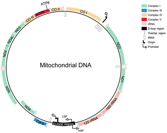 The special form of deoxyribonucleic acid is mtDNA. It is the only genetic material outside the nucleus that can be copied, transcribed and translated independently [17]. Human mtDNA is a circular-shaped, double-stranded DNA measuring about 16,569 bp. The mtDNA includes a G-enriched inner light strand (L-strand) and a C-enriched heavy strand (H-strand) [9,18]. Human mtDNA is a genetically compact genome with no introns, which overlaps in some regions. It encodes 2 rRNAs (16S RNA, 12S RNA) and 22 tRNAs for protein synthesis, as well as 13 peptides for electron transfer and oxidative phosphorylation. In addition to these coding areas, mtDNA also consists of a non-coding region, the displacement (D)-loop, which participates in the regulation of mtDNA replication transcription [19] (Figure 1).