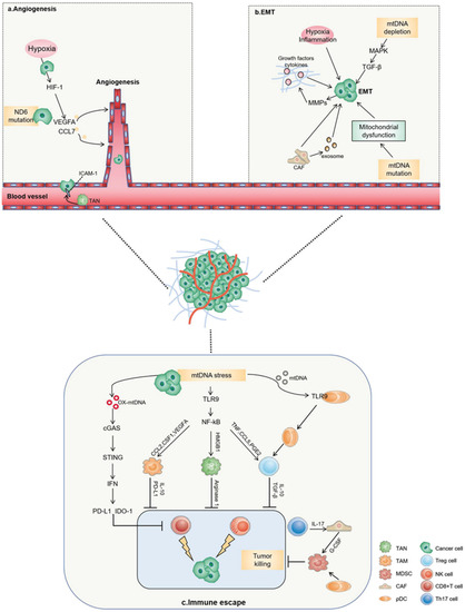 The association between mtDNA and tumor metastasis. (a) Angiogenesis is a rate-limiting factor in tumor growth. Cancer cells carrying the 13885insC mutation of the ND6 subunit have higher spontaneous metastasis potential. A PCR array analysis showed higher levels of VEGF, CCL7 and other metastasis-associated genes. The increase in VEGF and CCL7 levels is obviously an important factor in stimulating tumor blood vessel growth to promote tumor cell invasion, migration and infiltration. (b) EMT is a process in which the epithelial tumor cells lose adhesion ability and cause the migration of mesenchymal cells to promote metastasis and drug resistance. The mtDNA depletion can lead to a loss of characteristic epithelial cell features and to a mesenchymal phenotype being gained. The RAF/MAPK signaling pathway is highly activated and accompanied by the expression of TGF-β. The above suggest that the tumor cells acquire higher invasiveness. The mutations of mtDNA may be accompanied by decreased respiratory enzyme complex activity and mitochondrial dysfunction, which leads to the malignant phenotype of the tumor. (c) Tumor immune escape is a critical step in tumor metastasis and malignant progression. Oxidized mtDNA can be released into the cytoplasm, which induces IFN signals through cGAS-STING-TBK1, thereby upregulating the expression of PD-L1 and IDO-1 to inhibit the activation of T cells. It has been reported that mtDNA stress in HCC cells with increased mitochondrial division significantly increases CCL2 production by activating the TLR9-mediated NF-κB signaling pathway, thereby promoting TAM recruitment and polarization and consequently promoting tumor progression. Mitochondrial DAMP (including mtDNA) can activate neutrophils to generate NETs, which have been shown to promote cancer-related formation and are associated with accelerated metastasis. Immature pDC can recognize the CpG sequence on mtDNA through TLR9, and can induce the production of CD4+CD25+Treg cells after activation and maturation. Treg cells secrete cytokines IL10 and TGF-β, which produce powerful immunosuppressive functions.