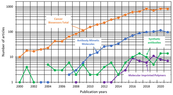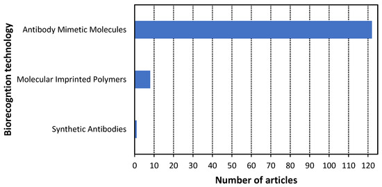 - RQ2: Which of these three technologies has been more studied?Antibody mimetic molecules were the most used biorecognition technology to detect cancer, comprising 93.1% of the studies. Subsequently, the molecularly imprinted polymers and recombinant antibodies correspond to 6.1% and 0.8%, respectively.