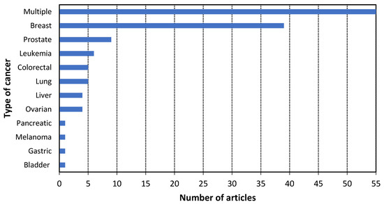 - RQ3: What types of cancer can be detected using these three technologies?With the study of the systematic review of the literature, we observed that it is possible to detect twelve types of cancer with these technologies. The most relevant types of cancer were multiple, breast, leukemia, colorectal, and lung. However, it is pertinent to highlight that these three technologies may also be efficient in detecting other types of cancer if more studies are conducted in the field.