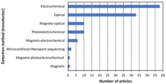 - RQ5: What methods are used for the detection of cancer by using these biomarkers?The detection methods are electrochemical, optical, magnetic, hybrid (photoelectrochemical, magneto-optical, etc.), microcantilever, and nanopore sequencing. The most common method was the electrochemical, followed by the optical.