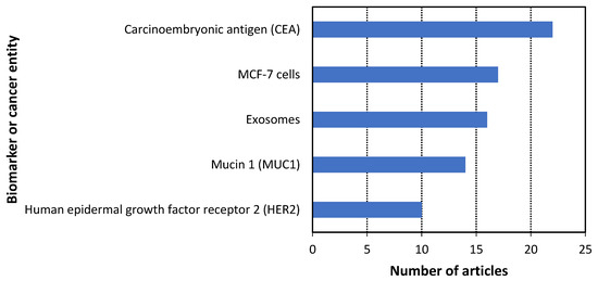 - RQ6: Which biomarkers and cancer entities are the most commonly studied?The most studied biomarkers and cancer entities were carcinoembryonic antigen (16.8%), MCF-7 cells (13%), exosomes (12.2%), mucin 1 (10.7%), and human epidermal growth factor receptor 2 (7.6%).