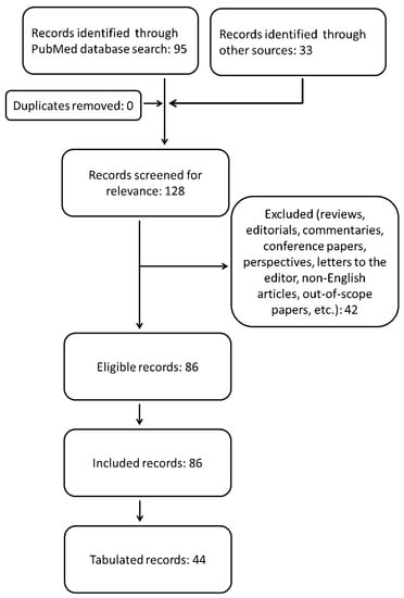Within the scope of the paper’s topic, we queried the PubMed/MEDLINE database from its inception to 31 December 2021, looking for articles on the use of radiotherapy for the treatment of locally advanced and/or metastatic cutaneous squamous cell carcinoma. We used the following search string: ((“advanced cutaneous squamous cell carcinoma”[Title/Abstract]) OR (“advanced cutaneous squamous cell carcinoma”[MeSH Terms]) OR (“metastatic cutaneous squamous cell carcinoma”[MeSH Terms]) OR (“metastatic cutaneous squamous cell carcinoma”[Title/Abstract])) AND ((“radiotherapy”[Title/Abstract]) OR (“radiotherapy”[MeSH Terms]) OR (“immunotherapy”[Title/Abstract]) OR (“immunotherapy”[MeSH Terms]) OR (“immune checkpoint inhibitors”[MeSH Terms]) OR (“immune checkpoint inhibitors”[Title/Abstract])). Humans and English filters were applied. We also included case reports and small case series due to the rarity of the scenarios investigated here. We discarded duplicates, editorials, comments, reviews and other papers which did not fit the aim of this work. Two authors (G.F. and P.P.) independently reviewed the titles and abstracts of the retrieved literature under the supervision of a third author (S.P.) who resolved any disagreement between them regarding relevance. The references for each paper were checked so as not to overlook any articles appropriate to this investigation. To better orient the reader among the included studies, we arbitrarily chose some of them as deserving of being tabulated for relevance according to our personal perspective (expert opinion). The collection and analysis of bibliographic resources was conducted according to the flowchart shown in Figure 1. All the relevant findings from full-text scanning each paper are summarized in the following paragraphs.