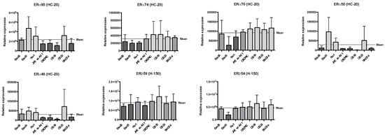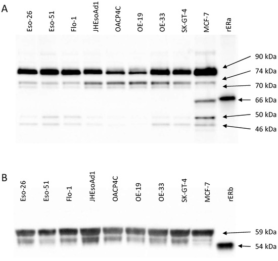 Relative expression levels of ERα and ERβ species, after normalisation to total protein load, are presented in Figure 2. Complete western blot and total protein load images are presented in Supplementary Figures S1–S4, and associated quantification data are presented in Supplementary Tables S2 and S3. The cell lines with the highest expression of ERα90 (Eso-51, Flo-1, and OE-33) also showed the highest expression of ERα50 and ERα46. Additionally, the expression patterns of ERα74 and ERα70 appear to be similar to each other and mirror the expression of ERβ59 and ERβ54.