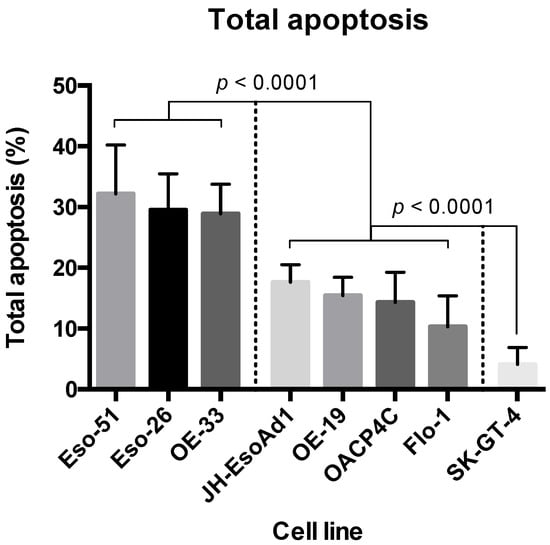 Tamoxifen treatment at 10 μM for 48 h led to statistically significant reductions in cell viability and concomitant increases in apoptosis in all eight cell lines. OE-33, Eso-26, and Eso-51 showed the highest levels of cytotoxicity; SK-GT-4 showed the lowest; the remaining cell lines showed a spectrum of responses within an intermediate group (Figure 3).