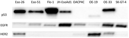 Western blots showing expression of p53, EGFR, and HER2 in oesophageal adenocarcinoma cell lines.