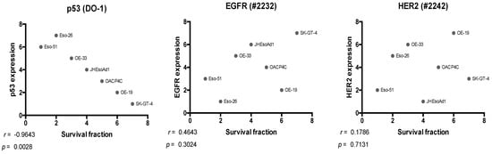 Scatterplots of rank showing relationships between survival fraction and the expression of p53, EGFR, and HER2. Spearman correlation. DO-1, anti-p53 primary antibody; #2232, anti-EGFR primary antibody; #2242, anti-HER2 primary antibody.