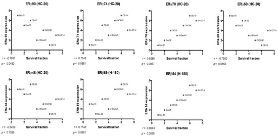 Oestrogen receptor expression data were correlated with treatment response data from the apoptosis assay by Spearman analysis. Significant correlations were found between cell survival and expression of ERα90 (ρ = −0.7857, p = 0.0480), ERα70 (ρ = 0.9286, p = 0.0067), and ERβ54 (ρ = 0.9643, p = 0.0028), as presented in Figure 7 (see Supplementary Figure S12 for analysis including the Flo-1 cell line). Relationships between survival and expression of ERα74 (ρ = 0.7413, p = 0.0881), ERα50 (ρ = −0.7500, p = 0.0663), and ERβ59 (ρ = 0.7143, p = 0.0881) were below the threshold for statistical significance.