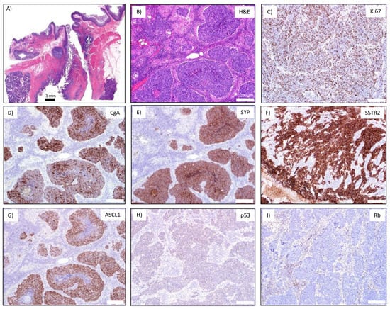 IHC analyses of NEC913 patient sample: (A) Primary NEC tumor at the ampulla of Vater. Scale bar represents 3 mm. (B) H&E staining of primary NEC tumor. (C–I) Staining for Ki67, CgA, SYP, SSTR2, ASCL1, p53, and Rb. Scale bar represents 200 μm.