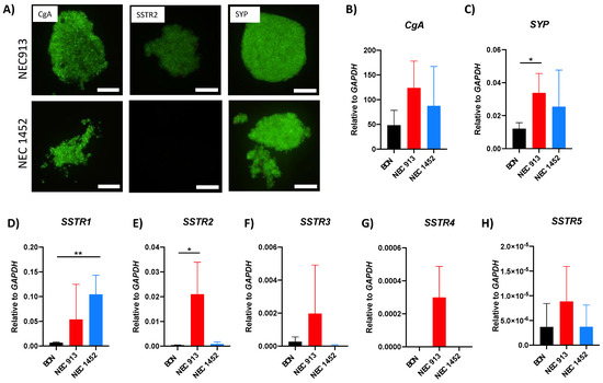 Characterization of NEC913 and NEC1452 cells for NET markers: (A) NEC913 and NEC1452 cells incubated with antibodies against CgA (1/300), SSTR2 (1/300), and SYP (1/600) overnight and with secondary antibodies coupled to FITC (1/500) for 1 h at room temperature. Microscopy pictures are taken using 200 ms exposure time. Scale bar represents 100 μm. (B–H) Gene expression analyses of NET markers in NEC913 and NEC1452 cells compared to BON cells. Gene expression levels were normalized to the control gene GAPDH to determine the relative fold change. Statistical analyses of gene expression changes were performed using T-tests in Prism GraphPad. p < 0.05 was depicted with *. p < 0.01 was depicted with **.