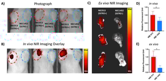 Application of NEC PDX models for SSTR2-targeted imaging: (A) Representative photograph of mice harboring NEC913 and NEC1452 tumors ranging from 1.0 to 2.0 cm in diameter 5 weeks post tumor cell injections from an n = 5 mice experiment. (B) Representative Near infrared (NIR) fluorescence imaging of mice harboring NEC913 and NEC1452 tumors using exposure time of 2 s and excitation and emission wavelengths set at 740 and 790 nm, respectively. NEC913 tumors are circled in red and NEC1452 tumors are circled in blue. (C) Representative ex vivo NIR fluorescence imaging of dissected NEC913 and NEC1452 tumors from an n = 5 mice experiment. (D,E) Quantifications of in vivo and ex vivo NIR fluorescence signal in NEC913 and NEC1452 tumors. T-tests were performed using Prism GraphPad. p < 0.05 was depicted with *.