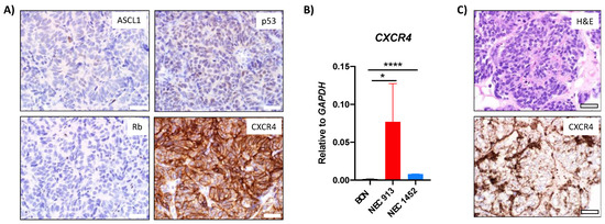Further characterization of the NEC913 PDX tumor by IHC showed low expression of p53, which could be due to the specificity of the antibody for the truncated form of p53, and no expression of Rb (Figure 5A), which is similar to the expression pattern observed in original patient tumor IHC analyses (Figure 2H,I). The expression of ASCL1 was lower in the NEC913 PDX tumor (Figure 5A) when compared to the original tumor (Figure 2G). In addition, the NEC913 PDX tumor expressed CXCR4 (Figure 5A). The CXCR4 expression was also detected in NEC913 spheroids by quantitative PCR and IHC using a specific antibody against CXCR4 (Figure 5B,C).